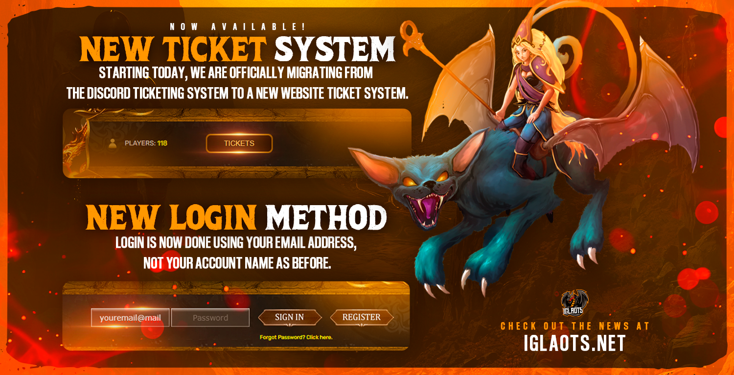 From now on, to report bugs, botters, or request support, please visit our website, log in using your email and password, and use the new “Tickets” option available in the navigation bar after logging in.